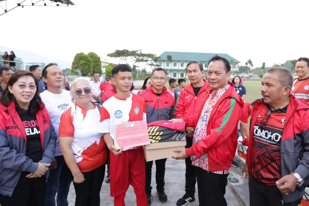 Pada kesempatan itu, Walikota menyerahkan bantuan berupa perlengkapan bagi para atlit, serta bantuan dana dan beasiswa senilai 3.500.000 kepada masing-masing atlit. Dilalukan juga pertandingan eksebisi tim GSI Provinsi Sulawesi Utara dan SSB Bina Putra Kota Tomohon. Dihadiri Kepala BPMP Sulawesi Utara Dr Febry Dien, Asisten Pemerintahan dan Kesra Sekda Kota Tomohon Drs ODS Mandagi MAP, Kepala Dinas Pendidikan Dan Kebudayaan Daerah Kota Tomohon Dr Juliana Dolfin Karwur Mkes Msi, Kepala dinas Pendidikan dan Kebudayaan Kabupaten Minahasa Tenggara Sarah Kindangen SPd MPd, Kepala dinas pendidikan dan olahraga kabupaten kepulauan talaud Deker Lasut MPd, Kepala dinas pemuda dan olahraga Kota Tomohon Ventje Karundeng, Mewakili kepala dinas pendidikan dan kebudayaan kabupaten kepulauan sangihe Suengli Waroka, Kepala-kepala sekolah dan guru-guru, Jajaran Pemerintah Kota Tomohon, Para Kontingen bersama orang tua.