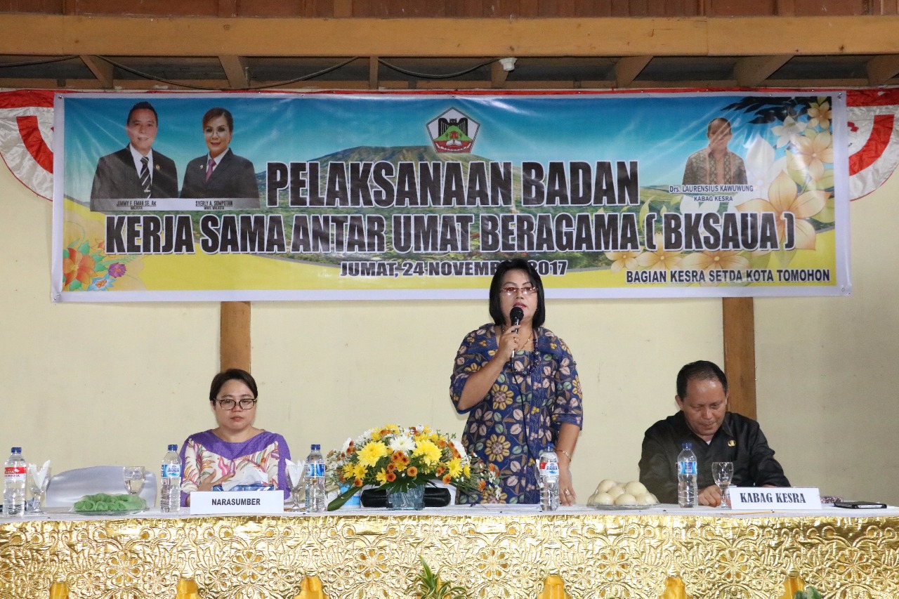 Walikota Tomohon, Jimmy F. Eman, SE. Ak dalam sambutannya yang di bacakan oleh Staf Ahli Bidang Administrasi & Sumber Daya Manusia, Mariam Rau, SH mengatakan bahwa salah satu keberhasilan pembangunan non fisik adalah terwujudnya kerukunan antar umat beragama. “Kerukunan umat beragama dapat diartikan sebagai hubungan sesama umat beragama yang dilandasi toleransi, adanya saling pengertian, saling menghormati dan menghargai kesetaraan antar sesama.” Ujar Rau saat membacakan sambutan Walikota.