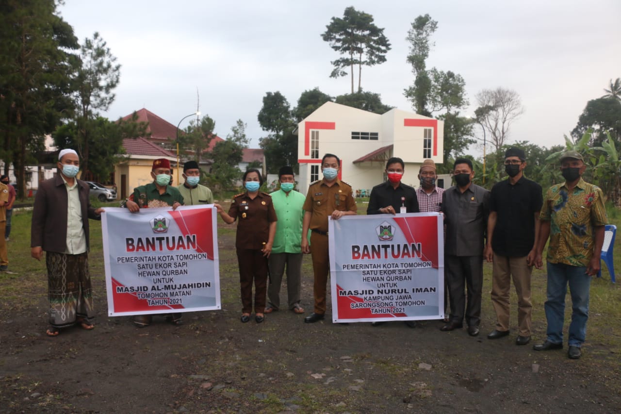 Bertempat di Lapangan Kantor Walikota Tomohon Walikota Tomohon Caroll Joram Azarias Senduk, S.H. menghadiri Kegiatan Penyerahan Secara Simbolis Hewan Kurban dari Pemerintah Provinsi Sulawesi Utara dan Pemerintah Kota Tomohon dalam rangka Perayaan Hari Raya Idul Adha 1442 Hijriah Tahun 2021 Pemerintah Provinsi Sulawesi Utara memberikan bantuan 1 ekor Sapi hewan kurban untuk Masjid Nurul Iman Kampung Jawa sedangkan Pemerintah Kota Tomohon memberikan bantuan 2 ekor sapi hewan kurban masing-masing 1 ekor sapi kepada Masjid Al-Mujahidin Matani dan Masjid Nurul Iman Kampung Jawa serta Bank SulutGo memberikan bantuan 3 ekor sapi hewan kurban masing- masing 1 ekor kepada Masjid Al-Mujahidin Matani, Masjid Nurul Iman Kampung Jawa dan Masjid Al- Mujahirin Uluindano