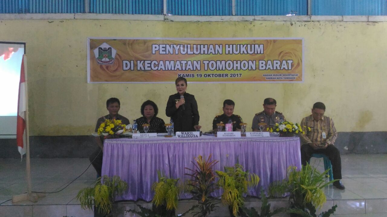 Walikota Tomohon melalui Wakil Walikota Tomohon, Syerly Adelyn Sompotan membuka Kegiatan Penyuluhan Hukum ini yang dihadiri oleh Kapolres Tomohon AKBP. I Ketut Agus Kusmayadi, SIK, Kajari Tomohon Edi Winarko, SH. MH, Ketua Pengadilan Negeri Tondano Julien Mamahit, SH. MH, Camat Tomohon Barat, Edvin Joseph, SSTP. M.Si, Kabag Hukum Setda Kota Tomohon Denny Mangundap, SH, Para Lurah, Para Aparatur Sipil Negara, Perangkat Kelurahan serta masyarakat se- Kecamatan Tomohon Barat.