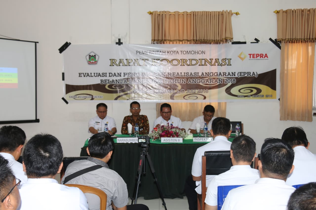 Wakil Walikota Tomohon, Syerly Adelyn Sompotan diwakili Asisten Perekonomian, Max Mentu, SIP, MAP menghadiri Rapat Koordinasi Evaluasi dan Pengawasan Realisasi Anggaran(EPRA) Belanja Daerah Periode Bulan Januari s/d Juli Tahun Anggaran 2018 bertempat di Ruang Rapat Badan Keuangan Daerah Kota Tomohon Rabu(29/08/2018).
