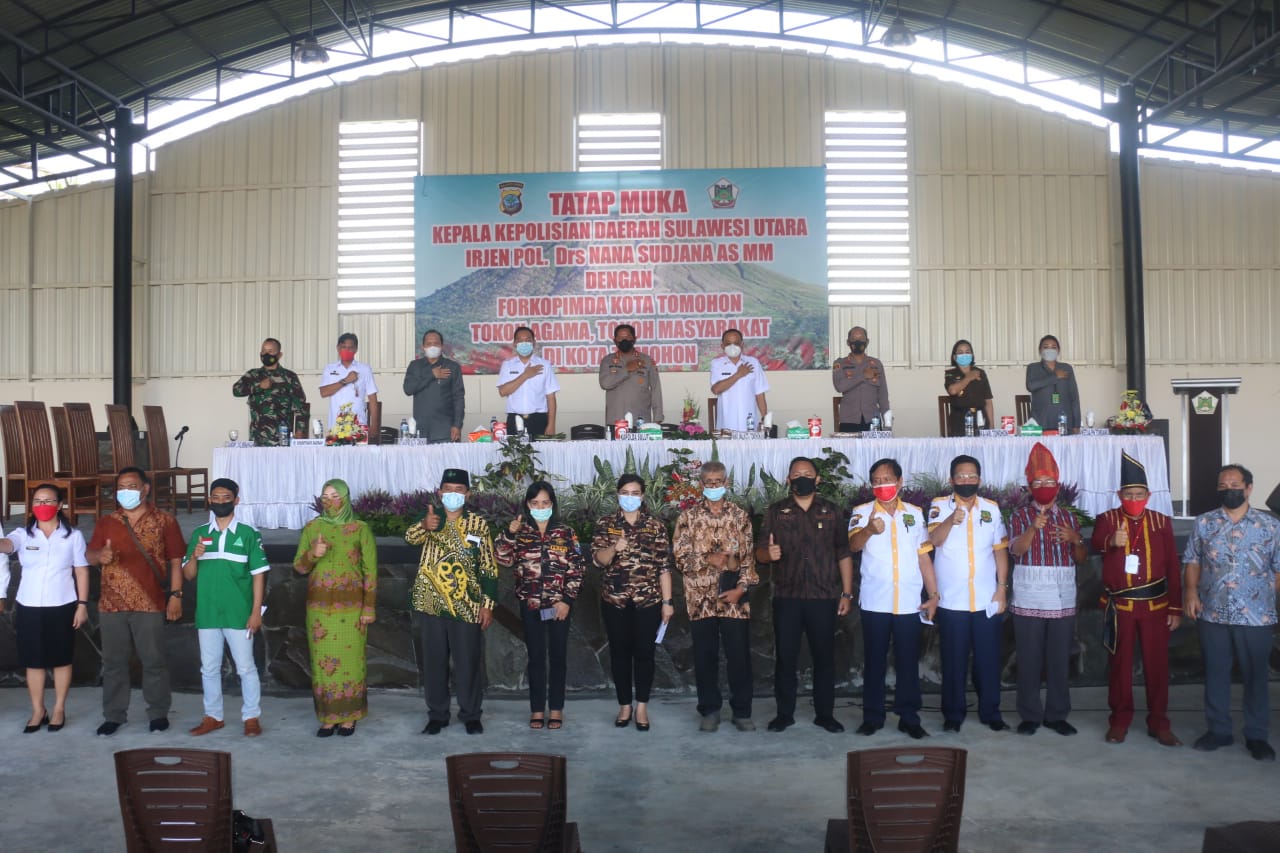Tatap muka Kepala Kepolisian Daerah (Kapolda) Sulawesi Utara Irjen Pol Drs Nana Sudjana AS MM dengan Forkopimda Kota Tomohon, tokoh agama, tokoh masyarakat, dilaksanakan di kediaman Wakil Walikota Tomohon, rabu (2/6/2021). Kapolda Sulut dalam sambutannya menjelaskan kunjungan saat ini adalah sebagai bentuk silahturami, tatap muka dengan Pemerintah Kota Tomohon termasuk Forkopimda, para tokoh agama dan tokoh masyarakat Kota Tomohon, dengan harapan kebersamaan, persaudaraan, kerjasama dalam berbagai hal tetap terus terjalin dengan baik sesuai semboyan ‘torang samua basudara’. Sinergitas Pemerintah Kota Tomohon dengan pihak kami akan terus berjalan dengan baik.