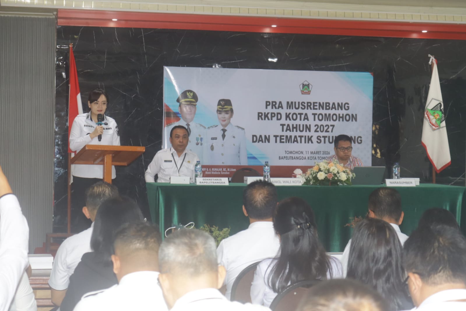 Wakil Walikota Kota Tomohon Sendy G. A Rumajar, SE, M.I.Kom menghadiri sekaligus membuka kegiatan Pra Musrenbang RKPD Kota Tomohon Tahun 2027 dan Tematik Stunting yang di laksanakan di gedung Inspektorat Kota Tomohon. Sambutan Walikota Tomohon yang dibacakan oleh Wakil Walikota Tomohon yaitu Kegiatan yg dilaksanakan ini merupakan forum pemantapan persiapan pelaksanaan Musrembang RKPD tingkat kota, untuk Sinergitas program dan kegiatan pembangunan daerah kota Tomohon sehingga diharapkan dokumen perencanaan pembangunan tahunan yang akan di dusun dapat menjamin tercapainya keterkaitan dan konsistensi antara Perencanaan, Penganggaran, Pelaksanaan dan Pengawasan serta merupakan bagian yang tidak terpisahkan dalam Tahapan Penyusunan Rancangan Anggaran Pendapatan dan Belanja Daerah(RAPBD).