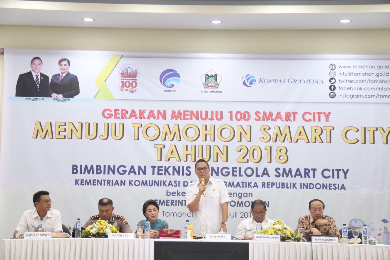 Kegiatan ini merupakan pembimbingan dari Kemenkominfo RI untuk Kota Tomohon yang masuk dalam Program Menuju 100 Smart City Indonesia dengan Narasumber/Pembimbing Teknis, Hari Singgihnoegroho, SE. Walikota Tomohon Jimmy F. Eman, SE, Ak hadir dan membuka kegiatan ini secara langsung. Dalam smabutannya Walikota 2 (Dua) Periode ini menyampaikan kebanggaan dan apresiasi kepada Kemenkominfo yang telah mempercayakan Kota Tomohon masuk dalam Program Smart City tahap pertama. Dan tentunya kepercayaan ini harus dibuktikan dalam tindak lanjut kegiatan selanjutnya oleh Tim. Walikota juga memaparkan materinya dalam program-program Kota Tomohon yang dituangkan dalam Program Dedicate “EMAS”.