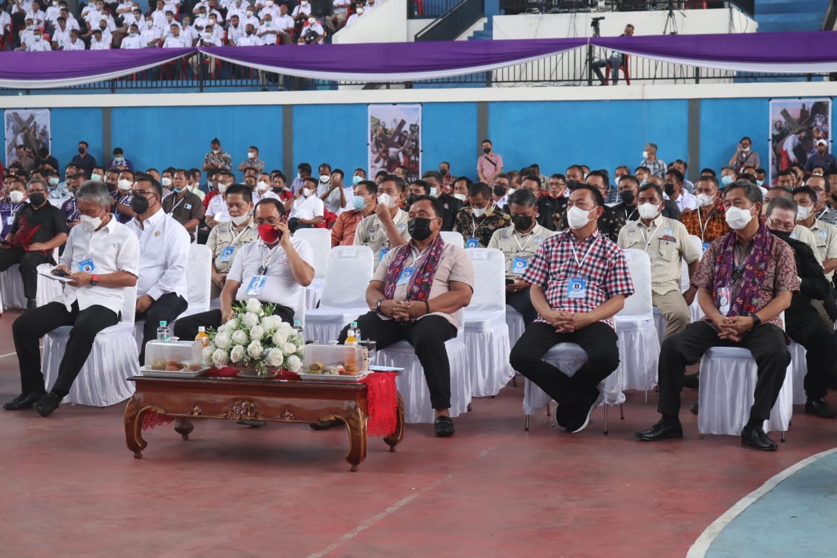Walikota Tomohon Pnt Caroll J A Senduk SH selaku Ketua Komisi PKB (Pria/Kaum Bapa) GMIM Wilayah Kakaskasen ikut dalam rapat pemilihan Komisi PKB Sinode GMIM periode pelayanan 2022-2027 yang digelar di GOR (Gelanggang Olahraga) Kompleks Stadion Dua Sudara Manembo-nembo Tengah Kecamatan Matuari Kota Bitung Wilayah Bitung tujuh Rayon Bitung, jumat (25/3/2022). Rapat pemilihan diawali dengan ibadah syukur yang dipimpin Sekum BPMS GMIM Pdt Evert Tangel STh MPdk, disusul ucapan selamat datang dari Walikota Bitung sebegai ketua panitia kegiatan Pnt Ir Maurits Mantiri MM. Gubernur Sulawesi Utara Olly Dondokambey SE dalam sambutannya berharap pemilihan Komisi PKB Sinode GMIM periode pelayanan 2022-2027 berjalan sesuai yang diharapkan tentunya sesuai dengan kehendak Tuhan. Sementara, Walikota Senduk mengatakan selaku Pemerintah Kota Tomohon menyampaikan selamat dan sukses atas pelaksanaan pemilihan Komisi PKB Sinode GMIM periode 2022-2027, kiranya Tuhan Yang Maha Kuasa akan menyertai tugas pelayanan Komisi PKB kedepan yang intinya untuk hormat dan kemulian nama Tuhan. Tampak hadir Ketua BPMS GMIM Pdt Dr Hein Arina bersama jajarannya, para Bupati Wakil Bupati bersama para Walikota Wakil Walikota beberapa Daerah di Sulut, Ketua Komisi PKB Sinode GMIM Pnt Dr Ir G S Vicky Lumentut SH MSi DEA bersama anggota, para Ketua Komisi PKB Wilayah/Jemaat GMIM, Sekot Tomohon Edwin Roring SE ME sebagai Ketua PKB Wilayah Lembean-Korakora.