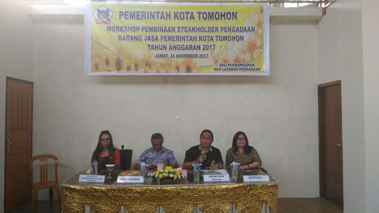 Jumat 24 November 2017 bertempat di Gedung ex Keuangan dilaksanakan Kegiatan Workshop Pembinaan Stakeholder Pengadaan Barang Jasa Pemerintah Kota Tomohon Tahun Anggaran 2017.